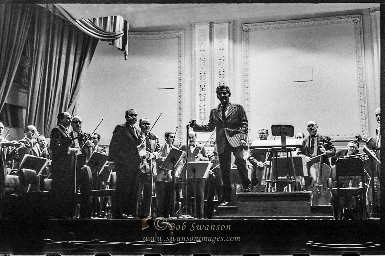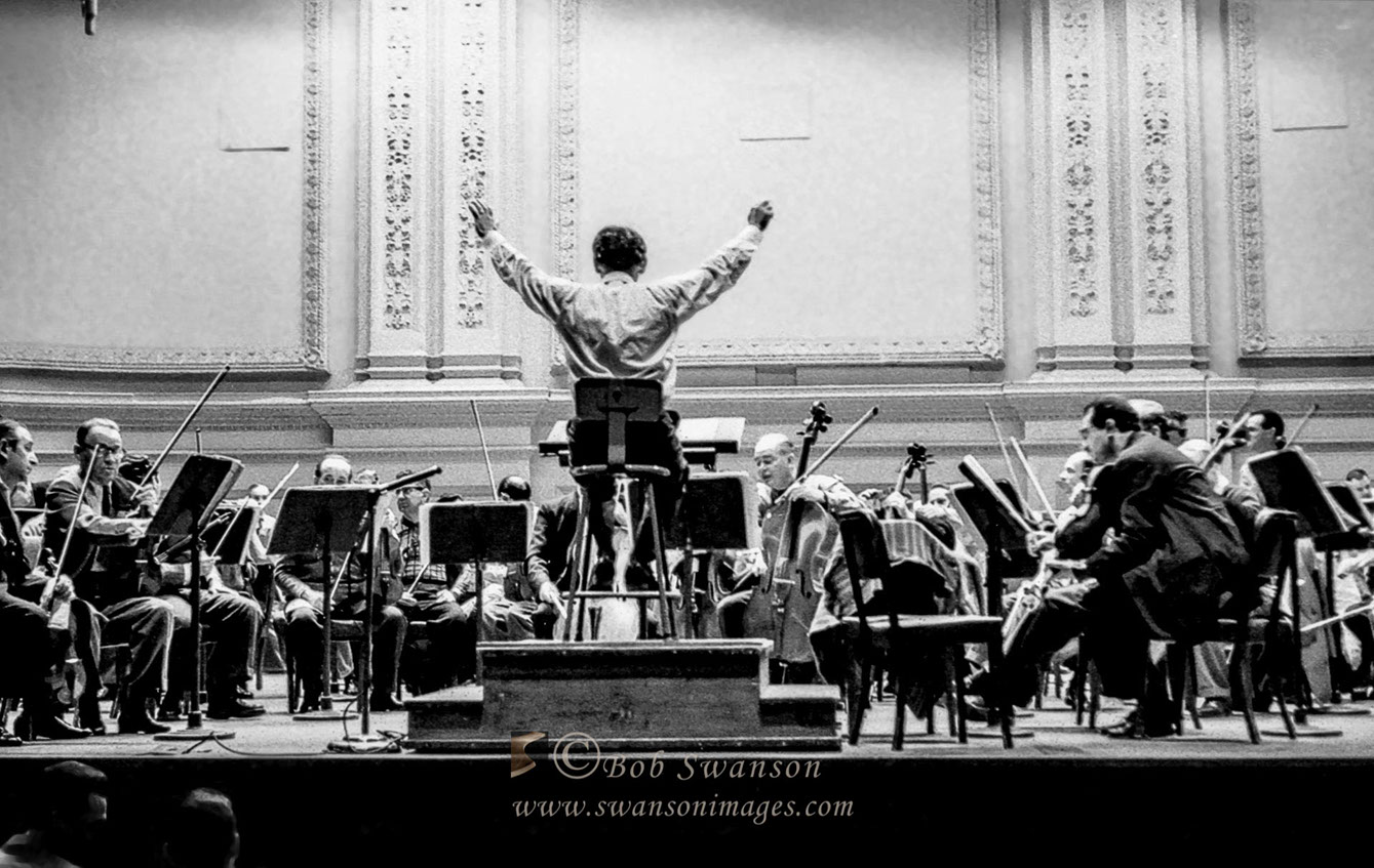 Leonard Bernstein conducting a free open rehearsal of the New York Philharmonic at Carnegie Hall.