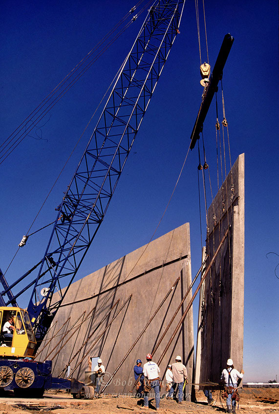 Tilt up, precast concrete wall panel being put into place for Central Valley California warehouse building.