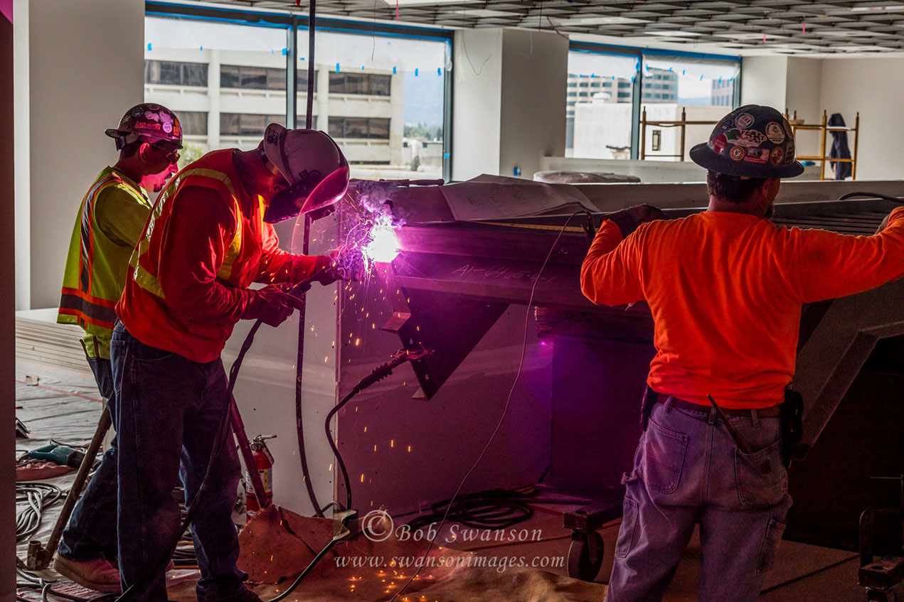 A welder joining exterior support steel columns at a Silicon Valley business park