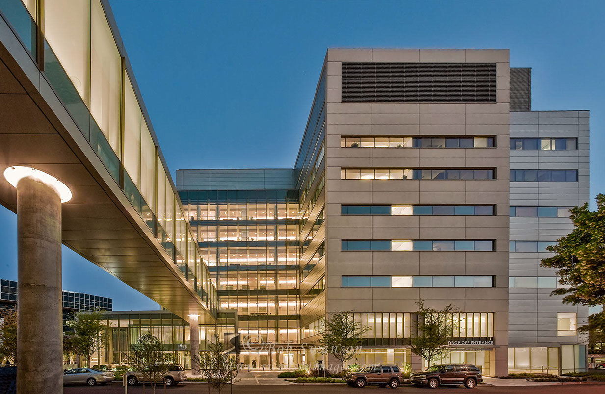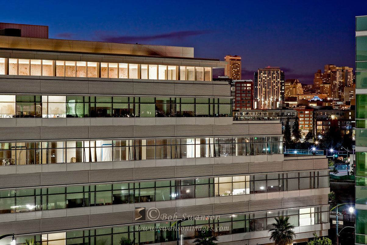 UCSF Helen Diller Cancer Research Center and San Francisco downtown twilight skyline.