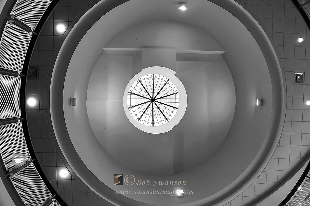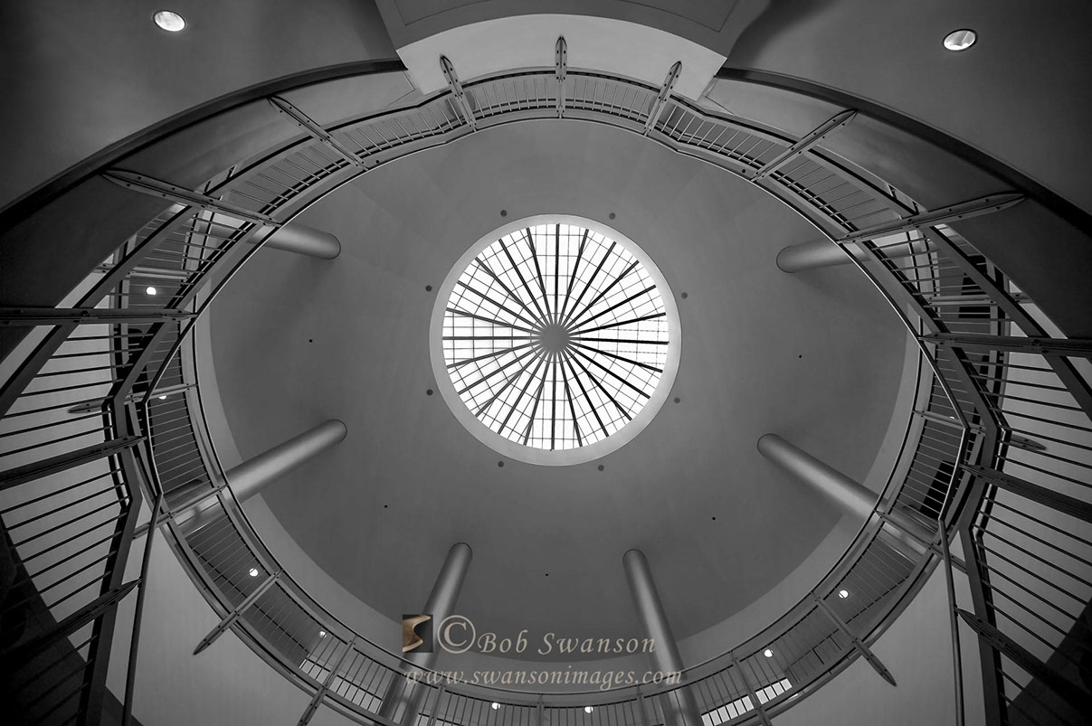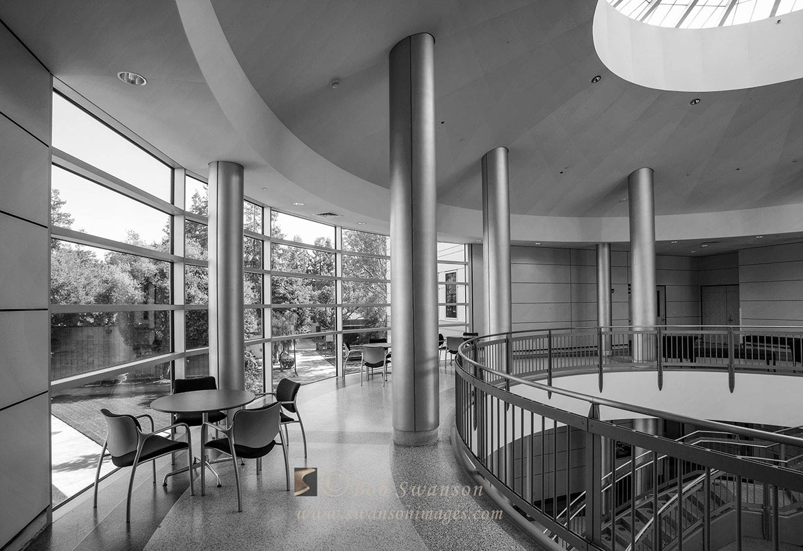 "Eye" ceiling with balcony rails and skylight at Hartnell Community College Library in Salinas, California for tBP Architects.