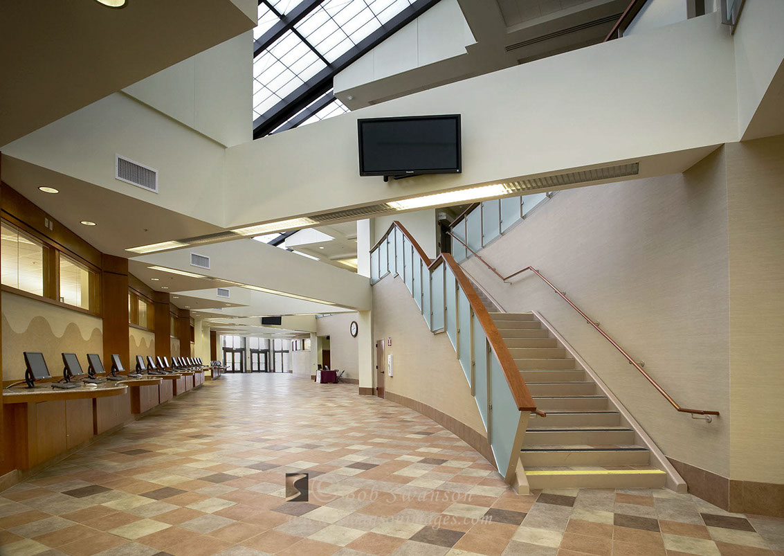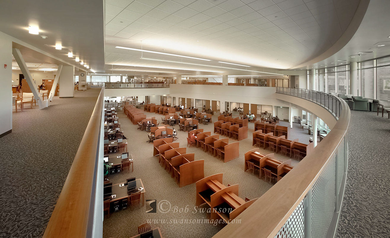 Balcomy interior of Hartnell community college library in Salinas, California for tBP Architects.