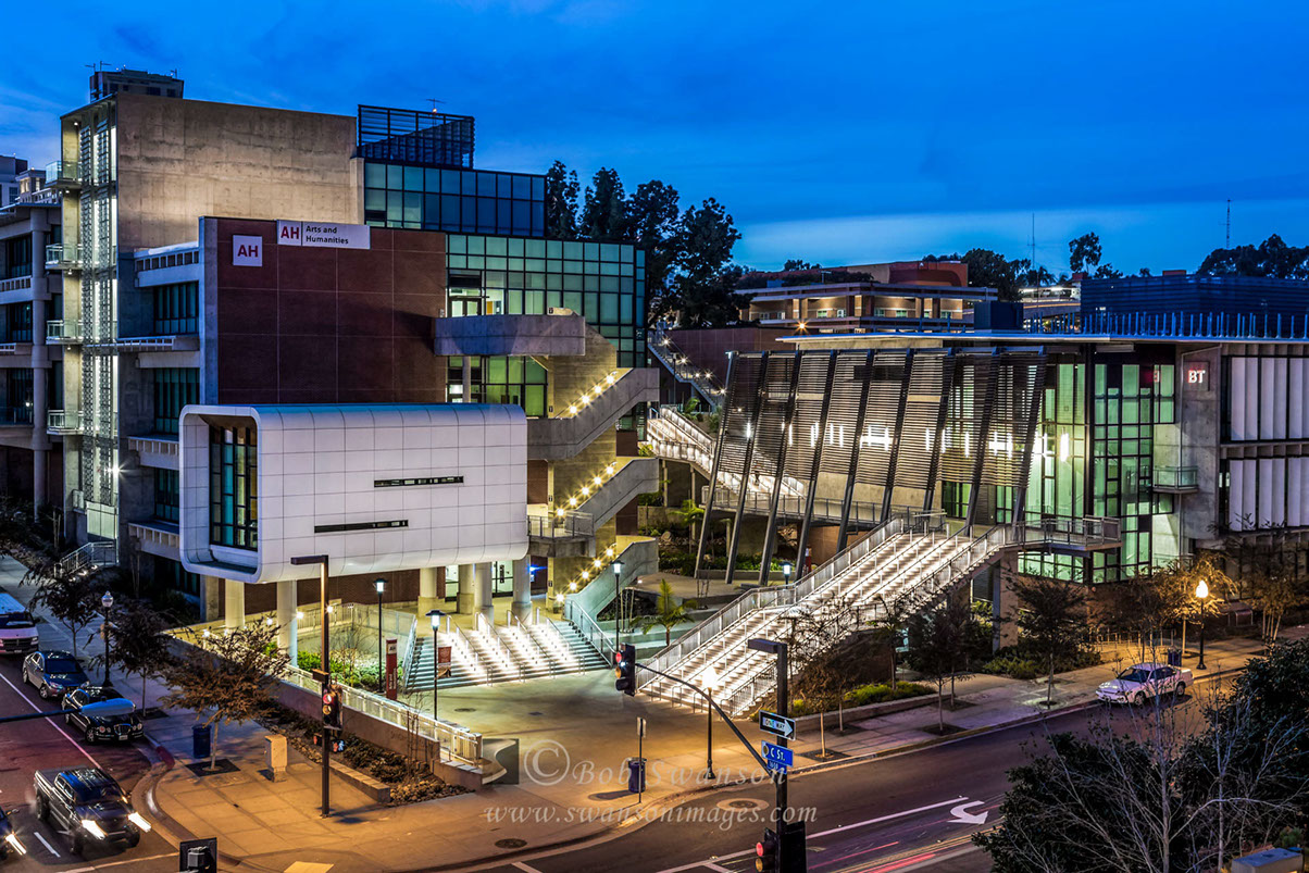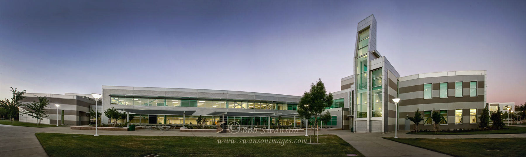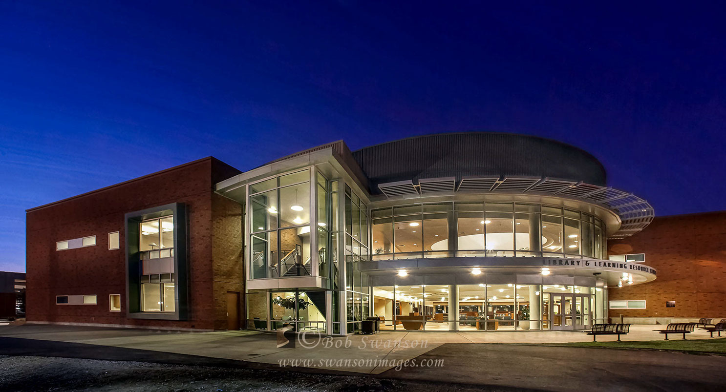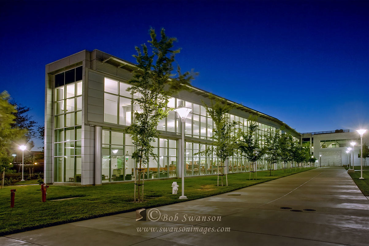 Night time at Hartnell Community College Library in Salinas, California for tBP Architects.