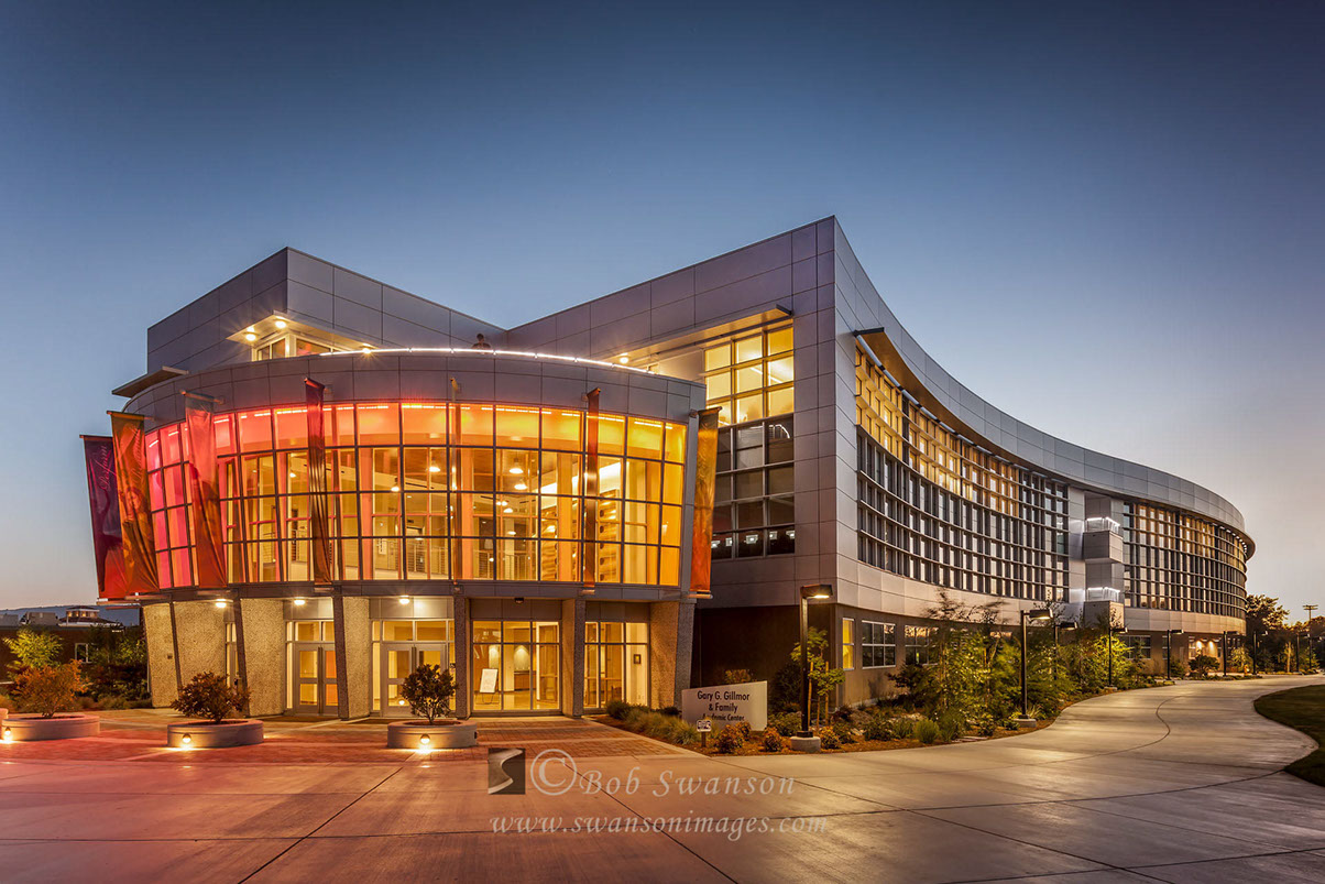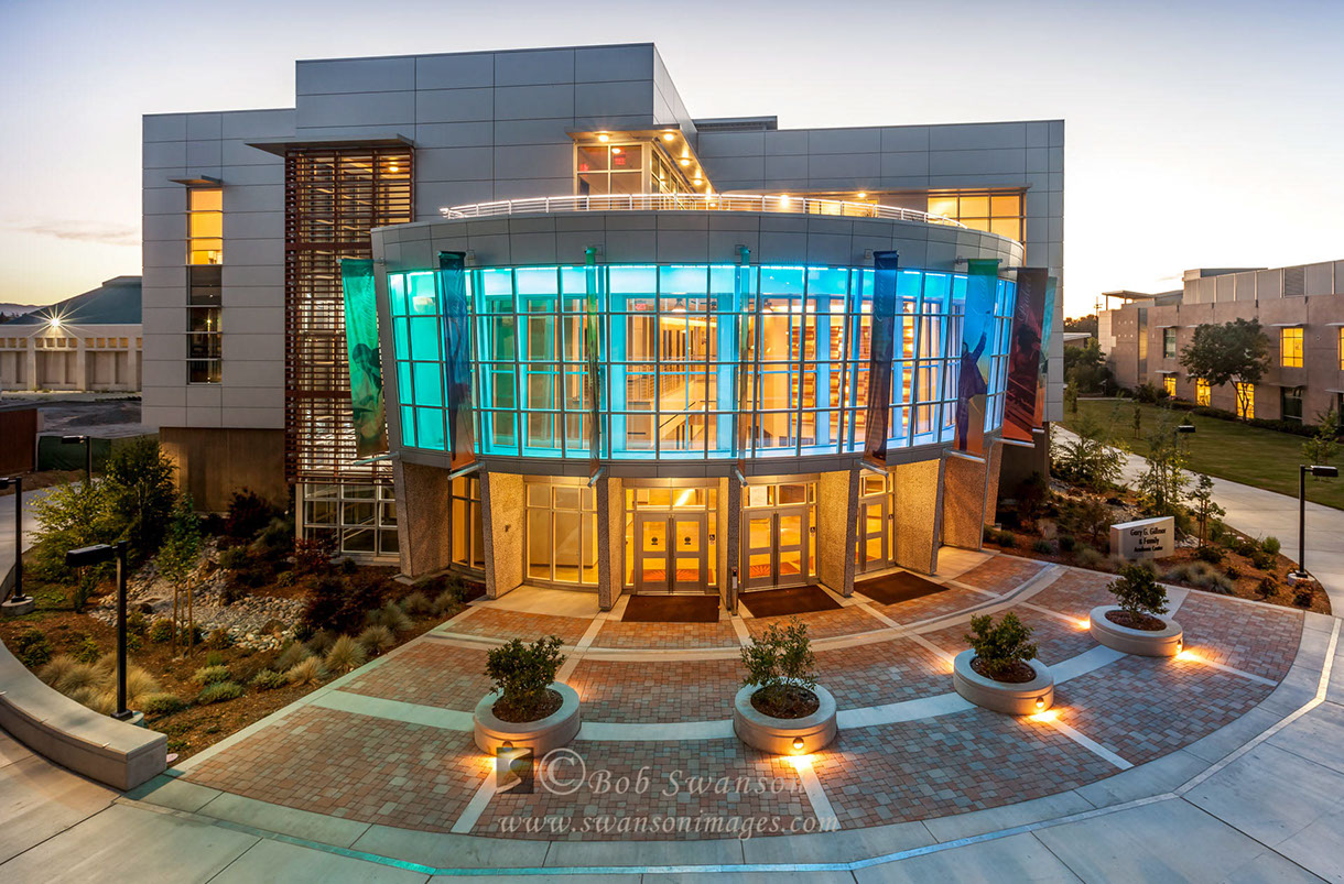 Twilight entry with color changing lights at Mission College Gilmor Center, Santa Clara, California.