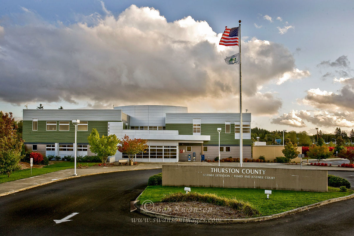 Thurston County Juvenile Justice Prison Facility entry with American flag Olympia , WA.