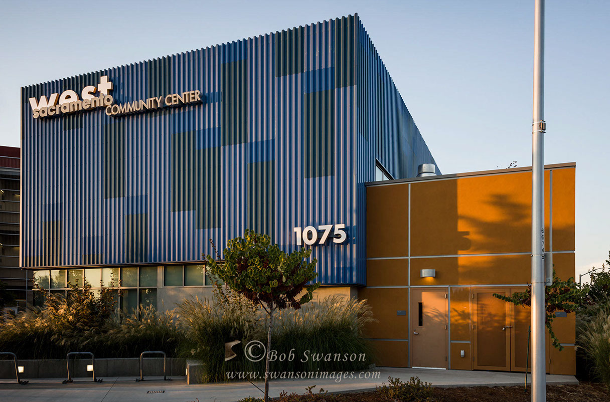 Blue corrugated siding twilight detail of the West Sacramento Community Center, California.