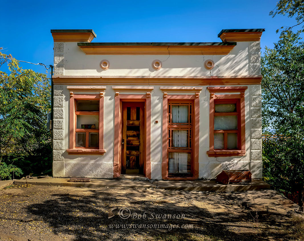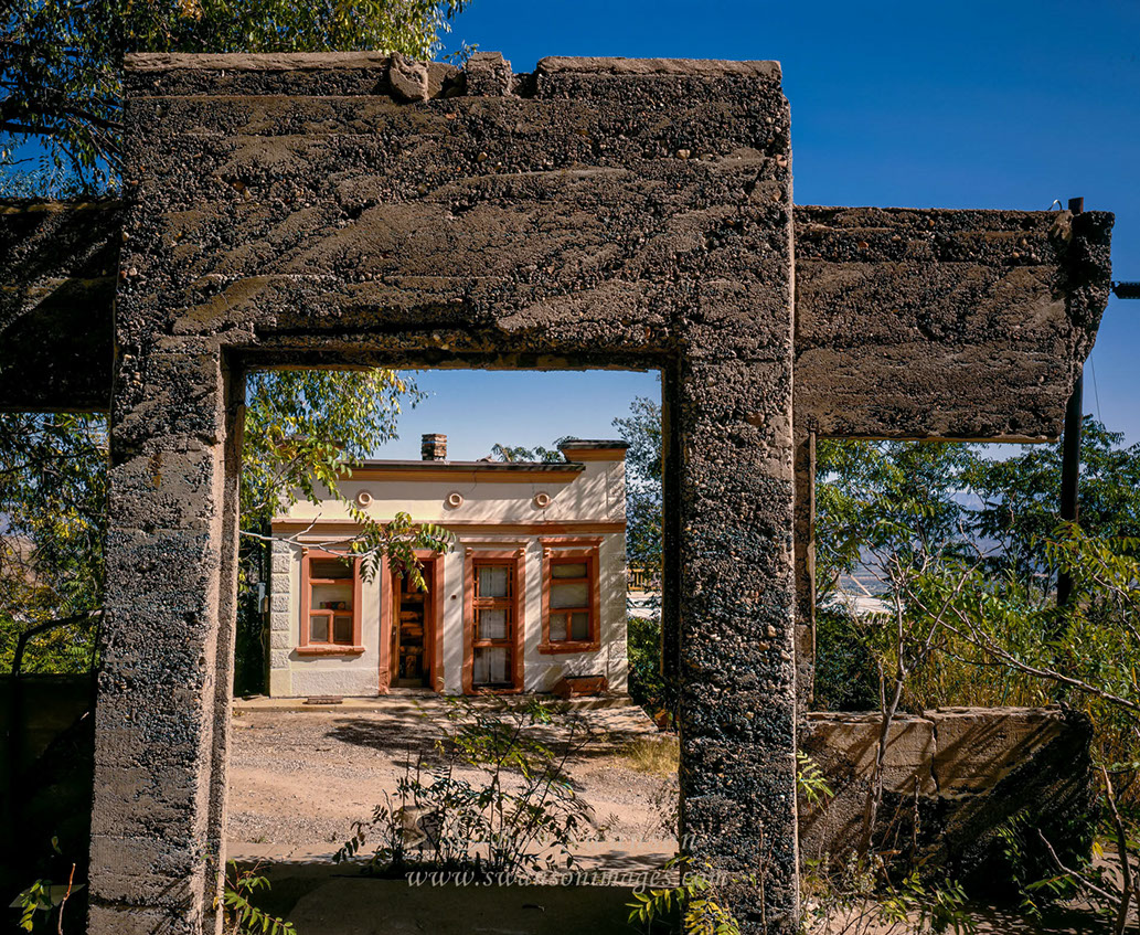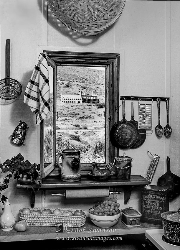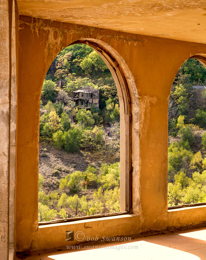 View of Daisy Hotel ruins from the kitchen window of the Powder Box Church for cover story for Country Home Magazine.
