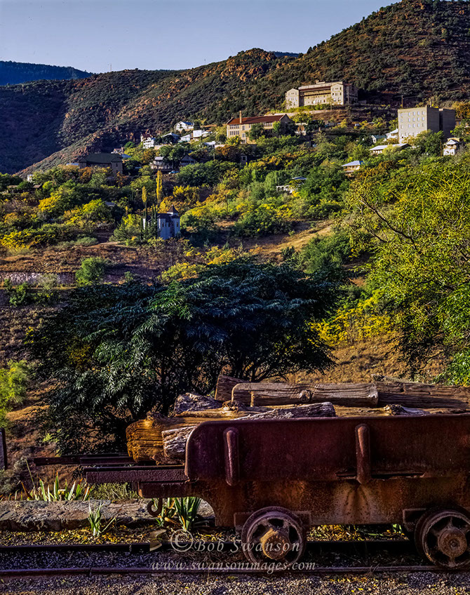 Mining car for hauling copper ore with the old Hospital on the Hill.