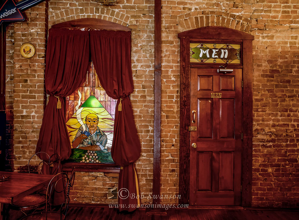 Men's room and stained glass.