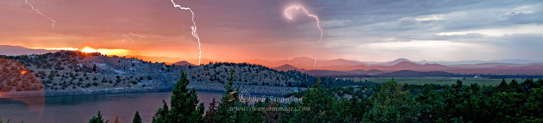 Panorama of Lake Shastina's Dwinnel Dam, lightning storm at sunset.