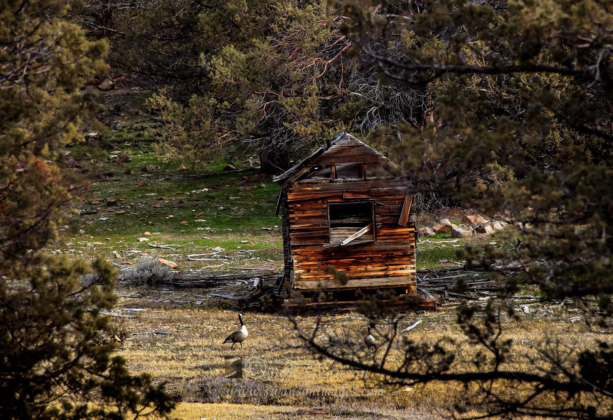 Cabin ruin and goose.