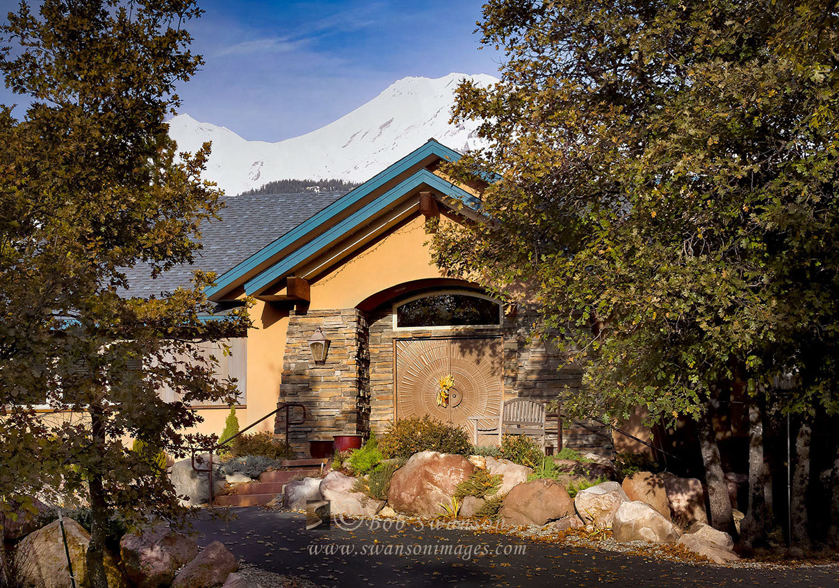 Wilder residence entry and Mt. Shasta. Ron Stevens, Architect.