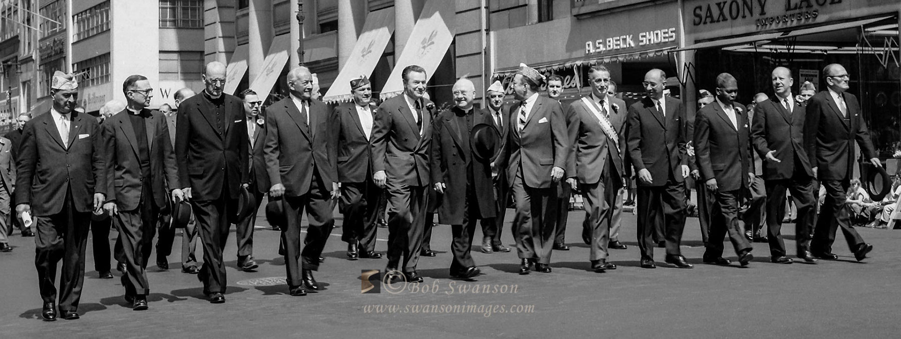 Governor Nelson Rockefeller, Mayor Robert Wagner, Bishop Fulton Sheen and many others marching in the 1959 Saint Patrick's Day Parade in Manhattan.