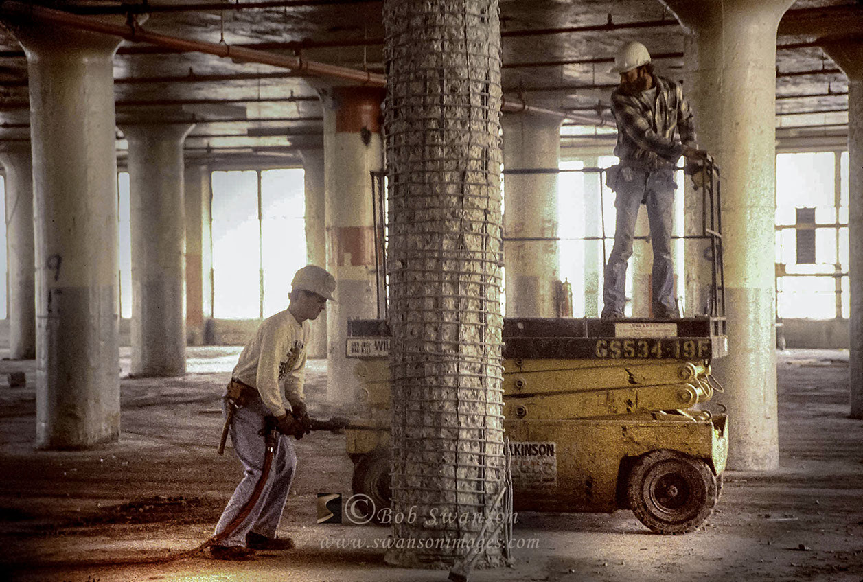 Carpenters re-framing for the restoration of the St. Francis Yacht Club, San Francisco after the 1989 earthquake.