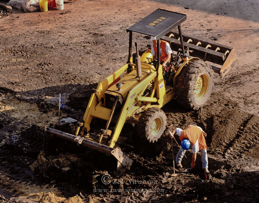 Hand work assist at excavation for footings for Silicon Valley construction site.