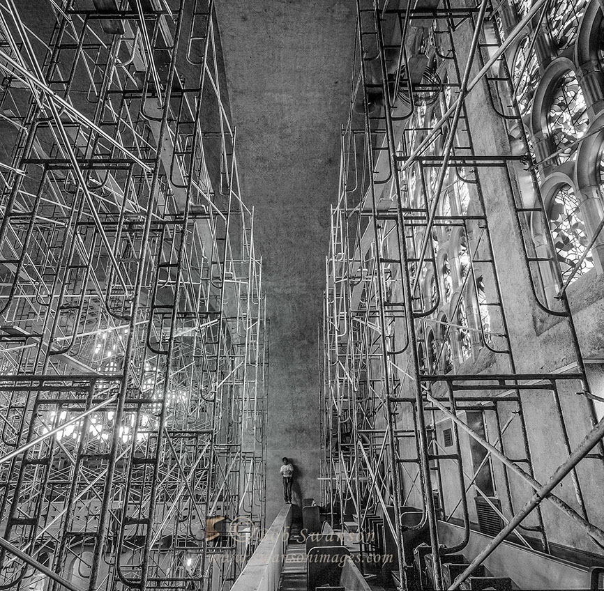 Set up of scaffolding for hazardous waste removal and restoration of the Temple Emanu-el with stained glass windows.