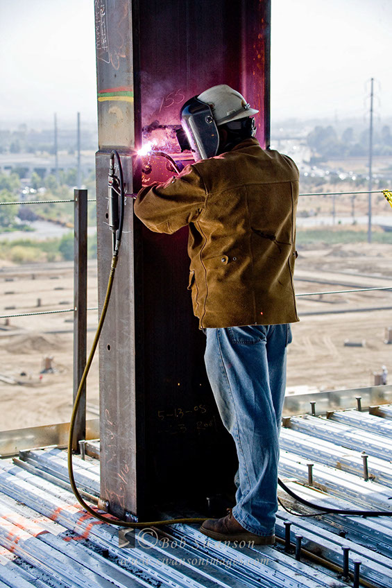 A welder joining exterior support steel columns at a Silicon Valley business park