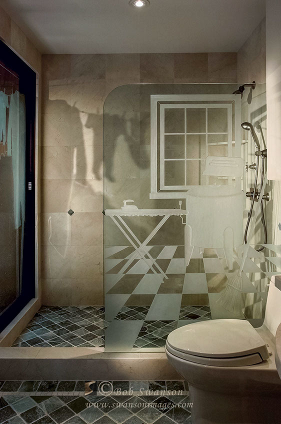 Playful etched glass panels in Marin County Bathroom for renowned glass artist, Vince Taylor