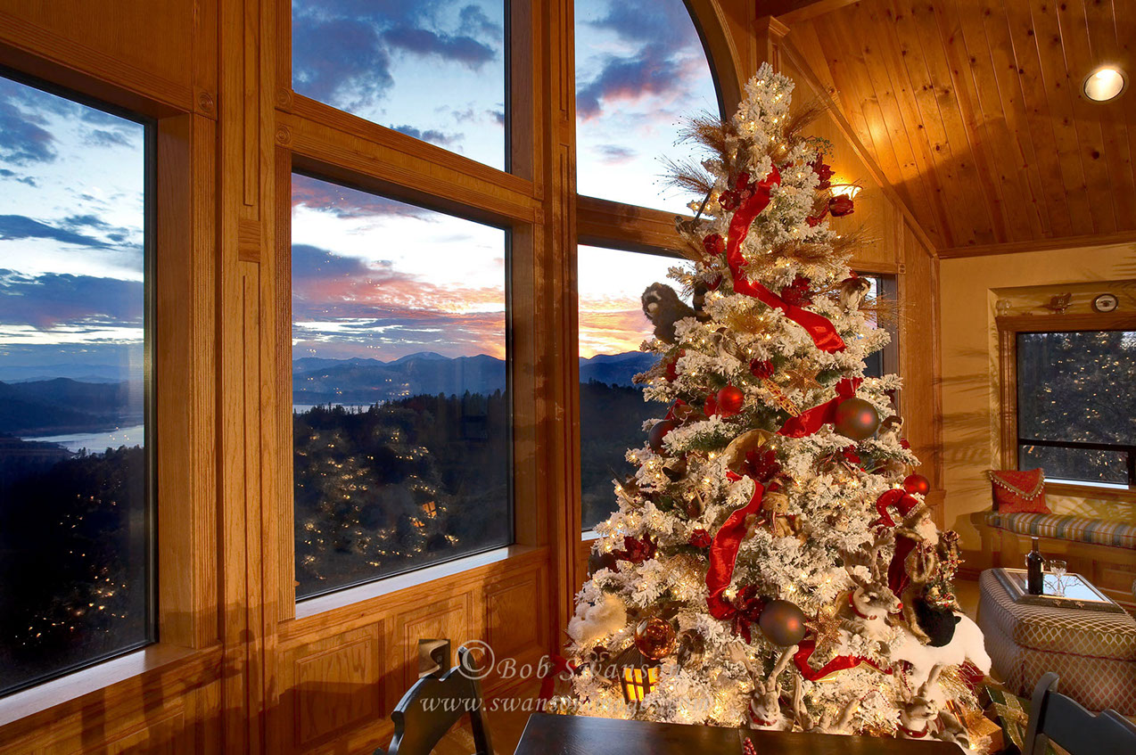 Christmas time in rustic Shasta Lake Estates home with lake view.
